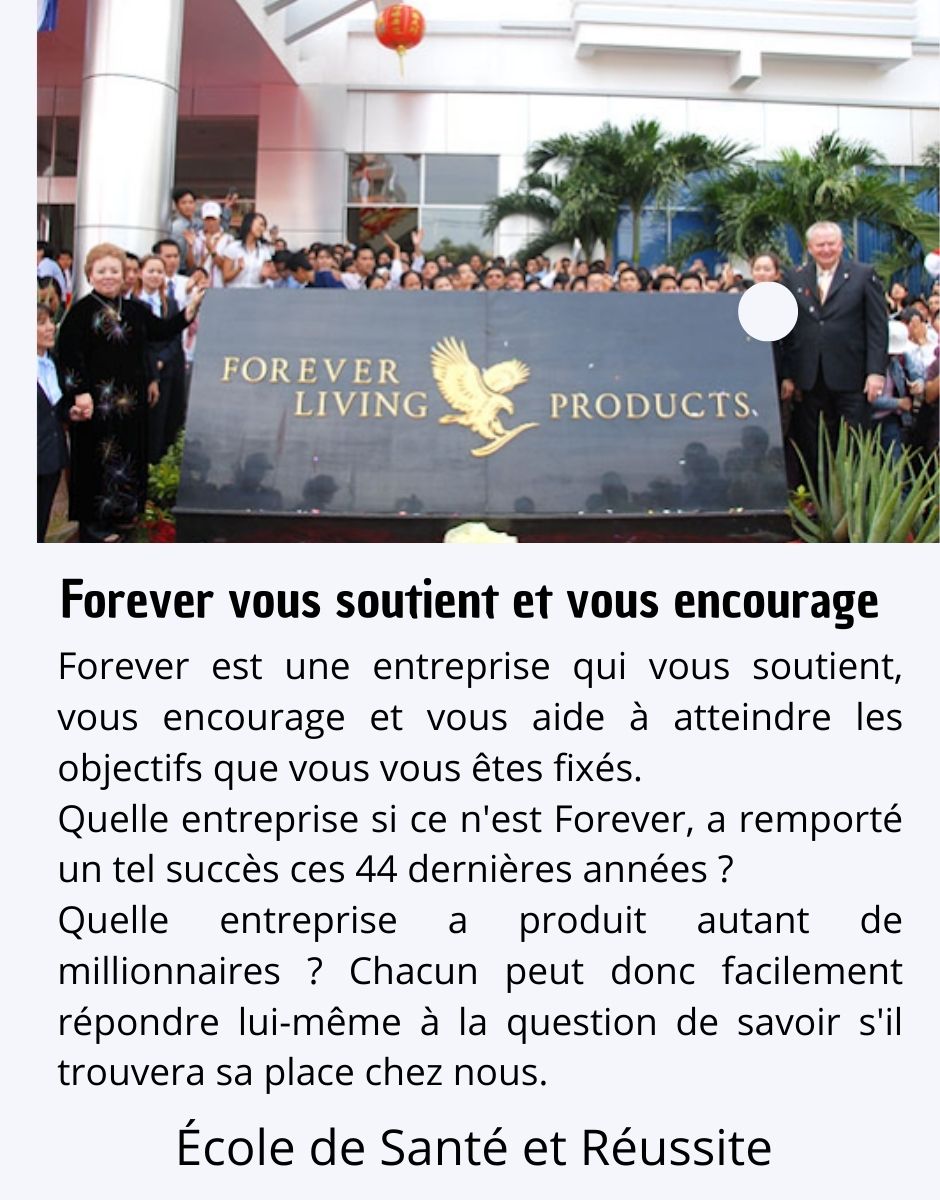 Les entrepreneurs de Forever sont des gens comme vous. Ils construisent un revenu tout en aidant les uns les autres. C’est comme cela que notre entreprise fonctionne. En vous récompensant de partager votre enthousiasme pour les choses que vous aimez. Que vous soyez à la recherche d'une réduction sur les produits ou d'un peu plus d'argent de poche, d'une nouvelle voiture ou même d'une toute nouvelle carrière, Forever peut vous aider